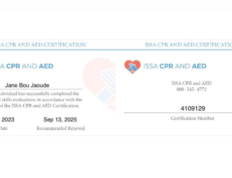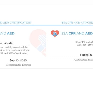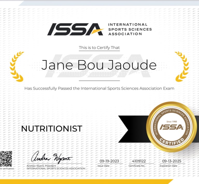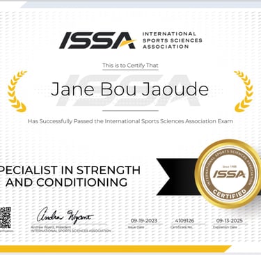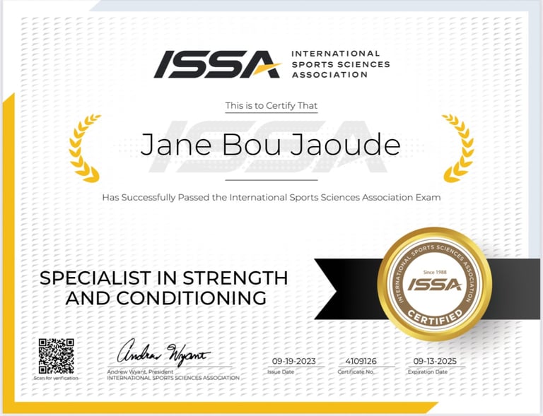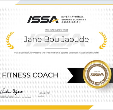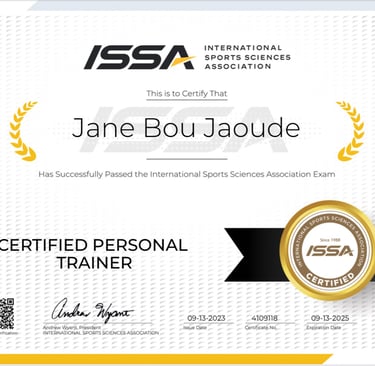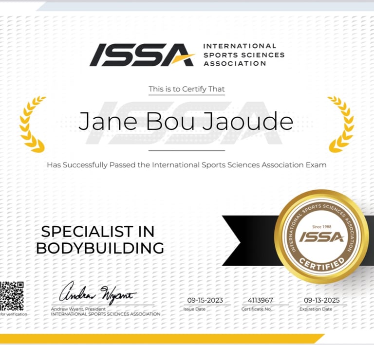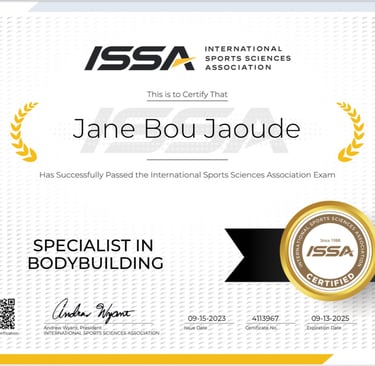 Official certifications earned from the International Sports Sciences Association, demonstrating verified expertise in personal training and fitness coaching. These credentials reflect a solid foundation of knowledge, professionalism, and commitment to health, wellness, and client transformation.